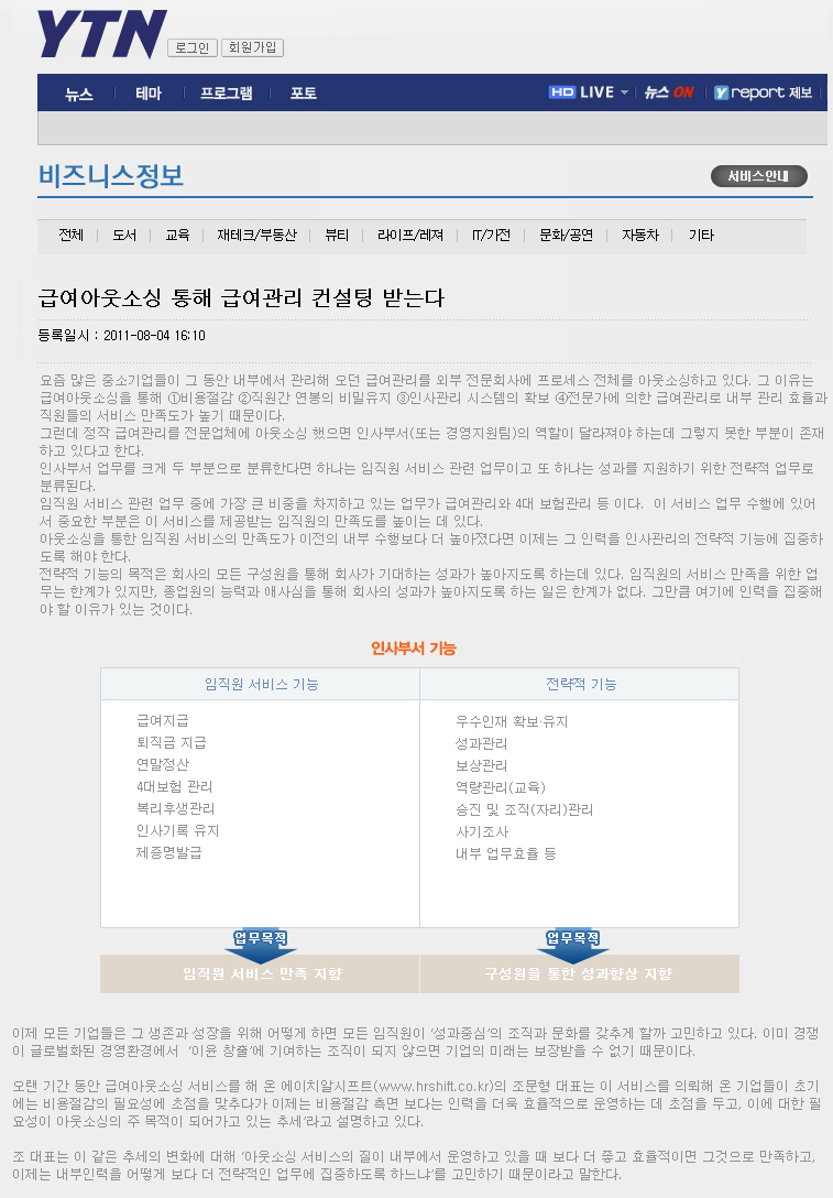 급여아웃소싱 통해 급여제도 컨설팅 받는다 등록일2025.12.08 조회수44 요즘 많은 중소기업들이 그 동안 내부에서 관리해 오던 급여관리를 외부 전문회사에 프로세스 전체를 아웃소싱하고 있다. 그 이유는 (이하 관련 신문기사 참조) 이전글 급여관리 아웃소싱 업체 이렇게 선택하라 다음글 다음 글이 없습니다. 목록