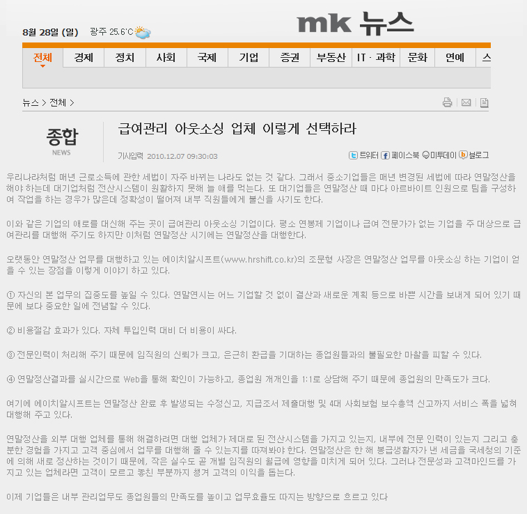 급여관리 아웃소싱 업체 이렇게 선택하라 등록일2025.12.08 조회수47 우리나라처럼 매년 근로소득에 관한 세법이 자주 바뀌는 나라도 없는 것 같다. 그래서 중소기업들은 매년 변경된 세법에 따라 연말정산을 해야 하는데 (이라 관련 기사 참조) 이전글 급여관리, 아웃소싱으로 비용 절감한다 다음글 급여아웃소싱 통해 급여제도 컨설팅 받는다 목록